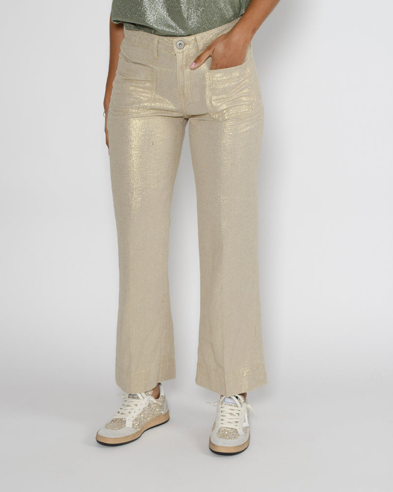On adore ce pantalon en lin doré de la marque Denim Studio pour sa matière légère et sa teinte lumineuse. Une pièce élégante et confortable, parfaite pour un look chic et estival !
