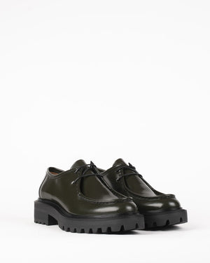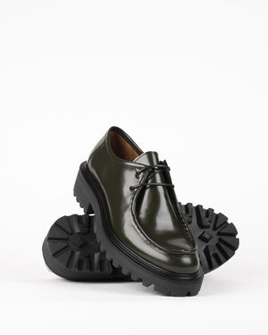 Cuir verni kaki / Finition brillante / Semelle crantée oversize / Silhouette robuste / Détail couture sur l’empeigne / Look affirmé / Style moderne et urbain / Parfaites avec un jean ou un tailleur structuré