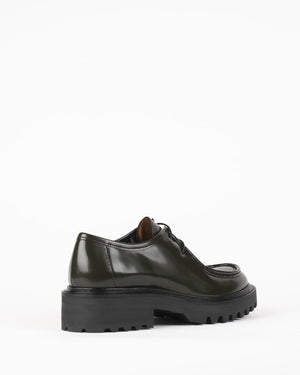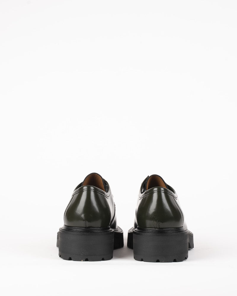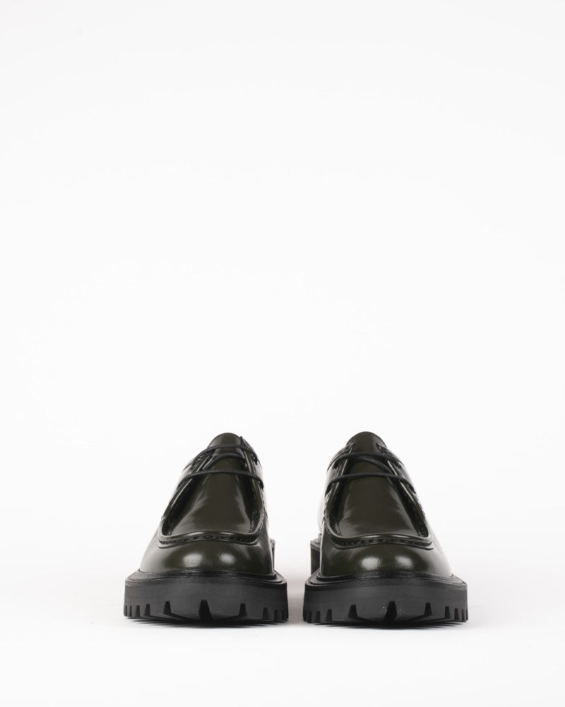 Cuir verni kaki / Finition brillante / Semelle crantée oversize / Silhouette robuste / Détail couture sur l’empeigne / Look affirmé / Style moderne et urbain / Parfaites avec un jean ou un tailleur structuré