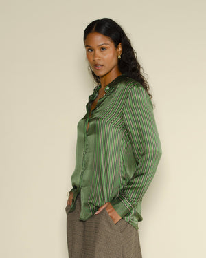 Vert à rayures multicolores / Poche plaquée sur le côté / Coupe légèrement longue / Col classique / Tissu fluide et léger / Style casual et coloré