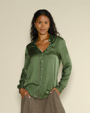 Vert à rayures multicolores / Poche plaquée sur le côté / Coupe légèrement longue / Col classique / Tissu fluide et léger / Style casual et coloré