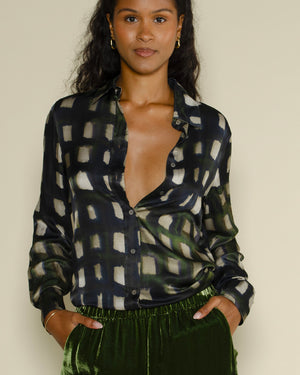 Carreaux effet peinture / Poche plaquée sur le côté / Coupe légèrement longue / Col classique / Tissu fluide et léger / Style artistique et décontracté / Fermeture boutonnée