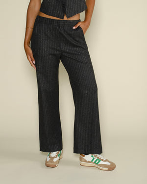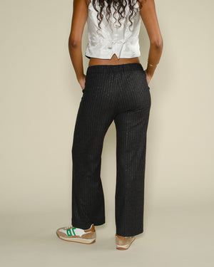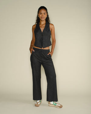 Couleur anthracite / Rayures verticales blanches / Coupe droite / Taille classique / Tissu fluide et léger / Style masculin-féminin / fines paillettes / fermeture zippée et bouton