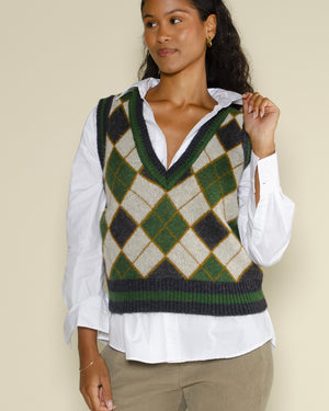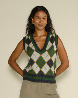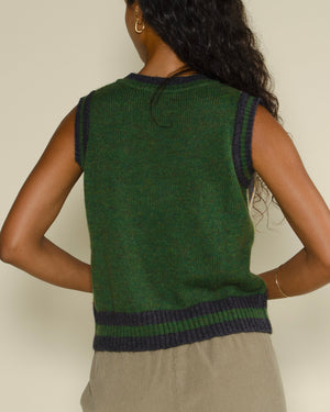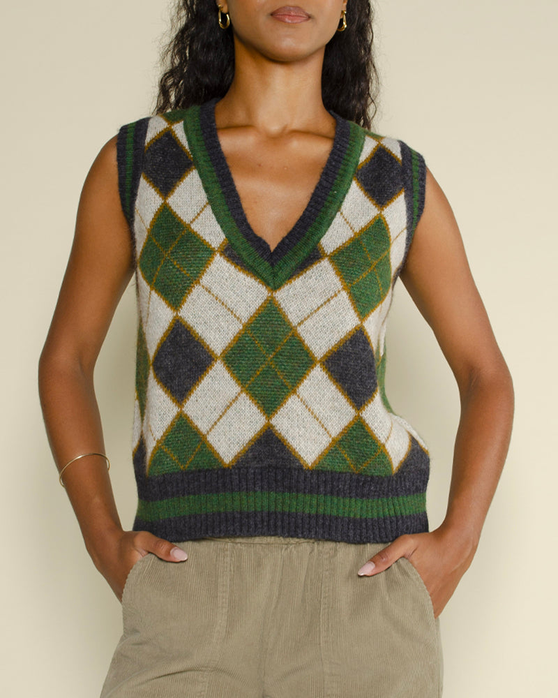 Tons vert, navy et blanc / Esprit preppy revisité / Encolure en V / Finition bord-côte / Coupe droite / Parfait en superposition sur une chemise ou un t-shirt