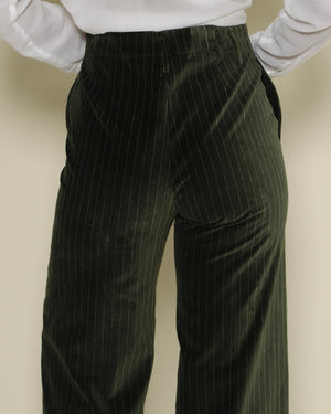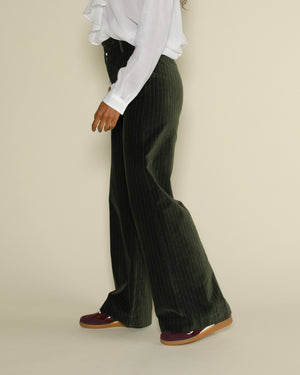 Matière velours côtelé ultra douce / rayures verticales blanches pour allonger la silhouette / Fermeture par bouton / coupe droite & élégante / mix entre confort & rétro