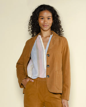 La veste Votro camel est une veste de blazer avec deux poches visibles à l'avant. Très confortable, légère et parfaite pour la saison estivale qui arrive.