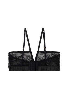 Le soutien gorge est non rembourrée noir, il est en dentelle avec des motifs floraux. La coupe est flatteuse avec un décolleté en V ainsi que des détails froncés sur le buste. Les bretelles sont réglables, ainsi que la fermeture à l'arrière.