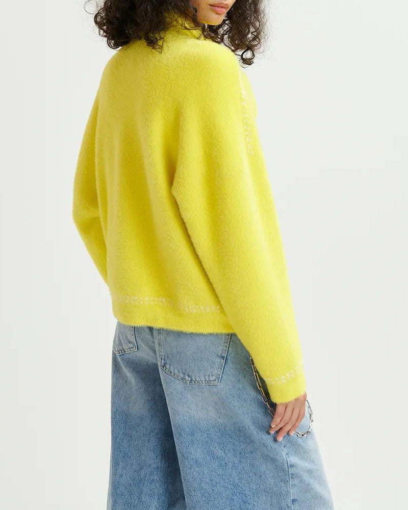 Cette veste jaune de chez Essentiel Antwerp vous apportera douceur et style, c'est certain. Avec un jeans brut ou une jupe longue, il est passe partout.