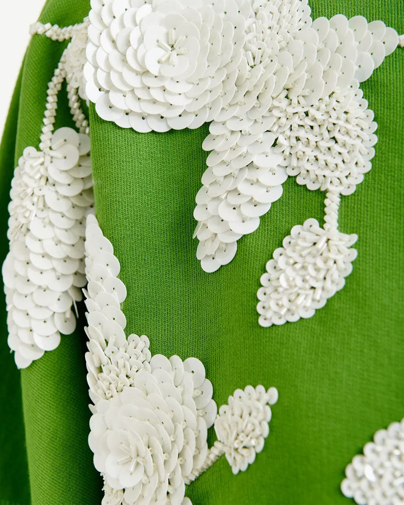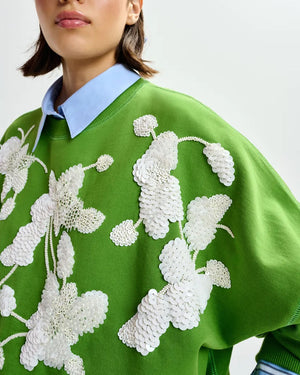 Sweat Essentiel Antwerp / vert vif avec broderies florales blanches en relief / coupe droite légèrement oversize / encolure ronde et finitions côtelées / look frais et printanier