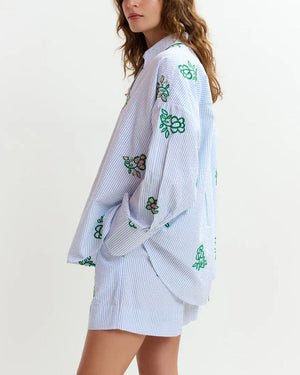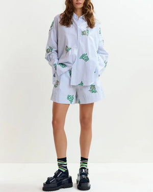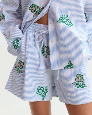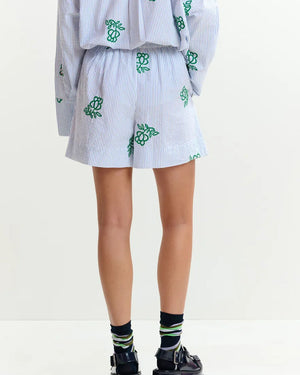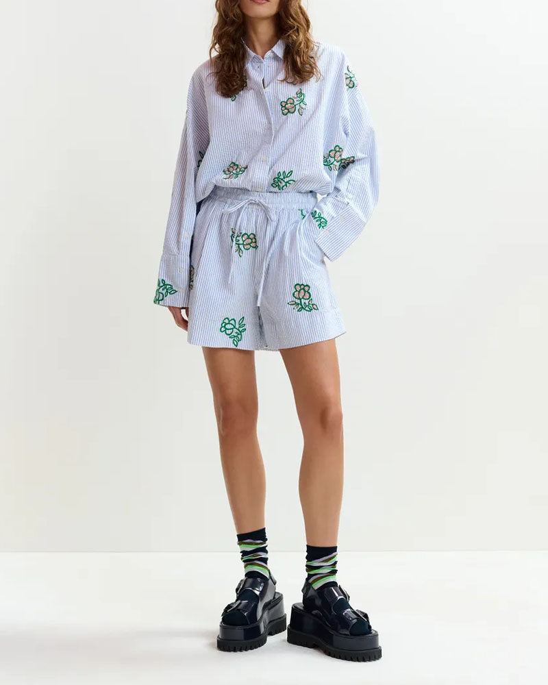 Short brodé Essentiel Antwerp / taille élastiquée avec lien ajustable / rayures fines bleu & blanc / broderies fleurs vertes / coupe fluide et légère / style assorti à la chemise brodée