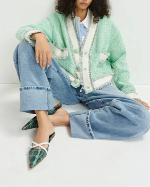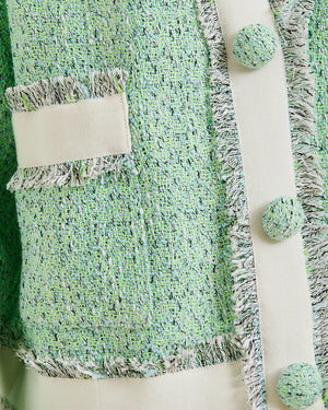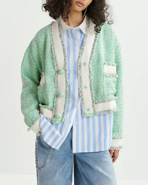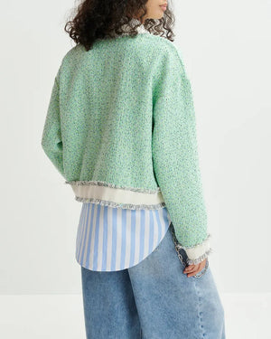 Une veste en tweed vert d'eau de chez Essentiel Antwerp. Pour les soirées fraiches d'été, elle saura vous réchauffer.