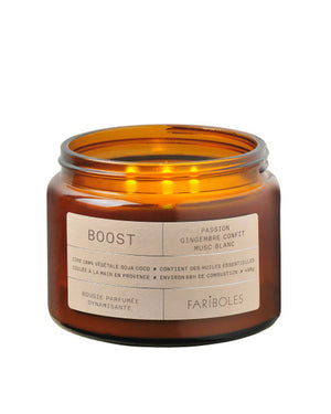 Appréciez le parfum dynamisant de la bougie Boost. Une bougie de la marque Fariboles qui réveille la vivacité du fruit de la passion, arrondie par la délicatesse du gingembre. On adore son parfum enrichi aux huiles essentielles.