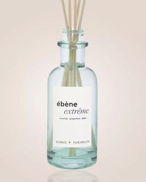 Un diffuseur mikado de la marque Fariboles qui embaumera votre intérieur d'une odeur enivrante et cocooning avec son mélange de muscade, gingembre et cèdre. Une création eco-friendly, vegan et zéro déchet, en verre recyclé et recyclable.
