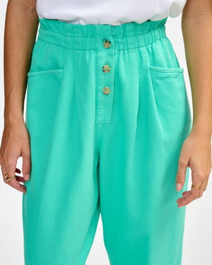 Le pantalon Lilo confectionné en coton et de stretch pour plus d'aisance et de confort a une taille haute élastiquée. La coupe est droite et les jambes sont légèrement fuselées.