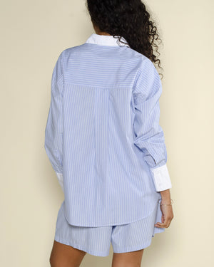 Chemise rayée bleu et blanc pour femme de la marque Five. On adore les détails blancs sur le col et les manches, qui apportent une touche mode à la chemise. De plus, les rayures lui confèrent un côté estival parfait pour la saison, à porter avec un short long pour un look ultra tendance !