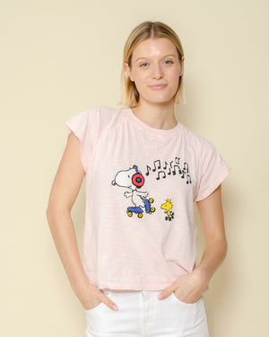 T-shirt Five / coloris baby pink / illustration Snoopy & Peanuts en rollers avec notes de musique / coupe fluide et confortable