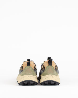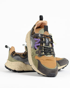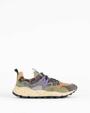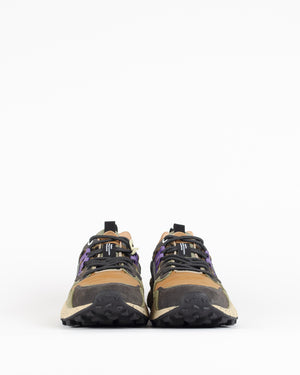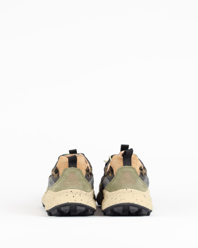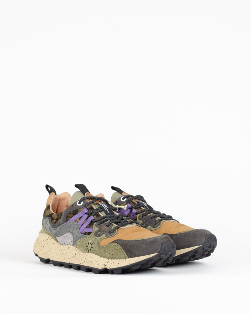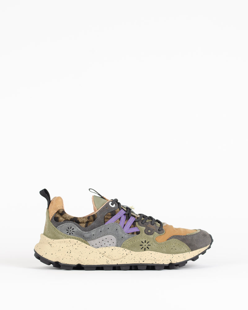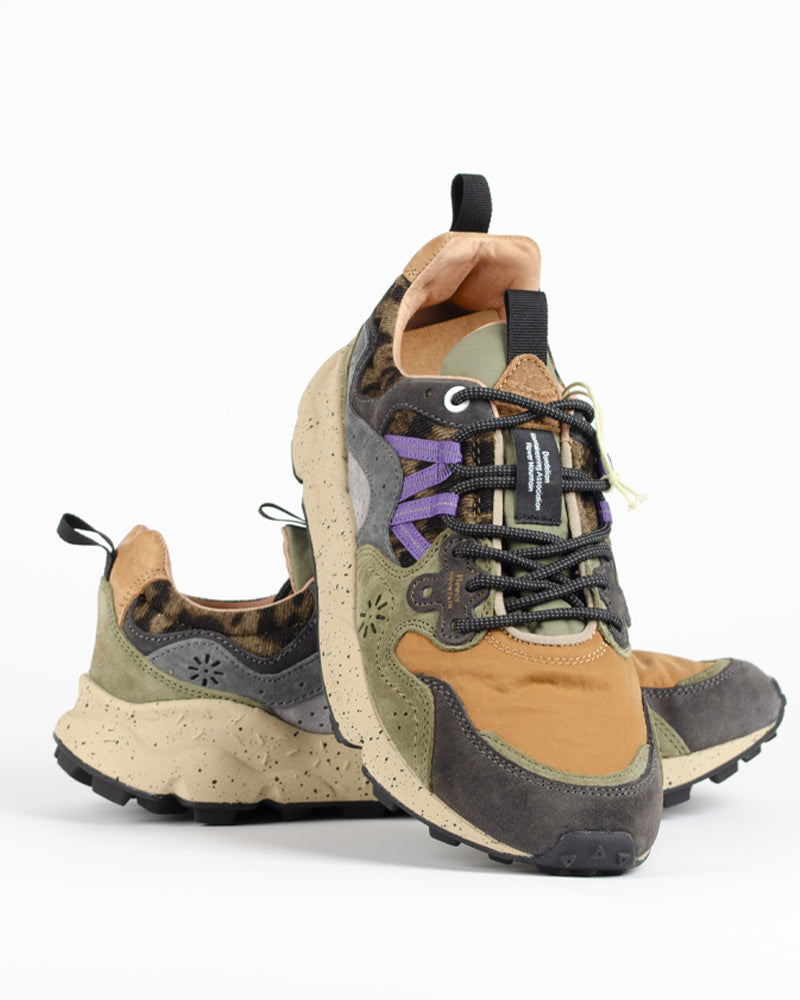 Baskets Flower Mountain kaki / Coupe sportive inspirée trekking / Tige en tissu technique et cuir suédé / Semelle crantée imposante et durable / Semelle intérieure en liège / Mélange de couleurs kaki, gris, camel et touches violettes