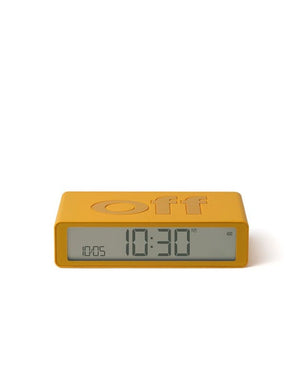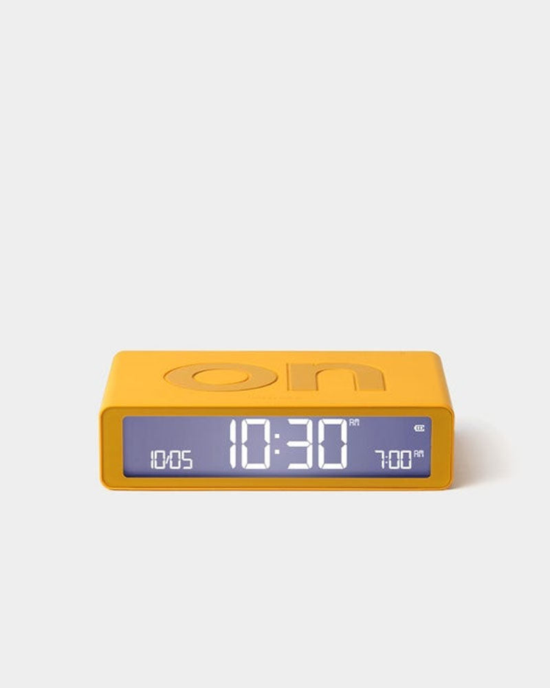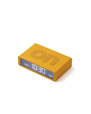 Réveil réversible LCD / coloris jaune / faces on & off / écran LCD avec 3 niveaux de luminosité / fonction snooze et rétroéclairage tactiles / rechargeable via usb-c avec câble inclus / autonomie jusqu’à 6 mois / temps de charge 4 h / alimentation via adaptateur secteur usb 5v (non inclus)