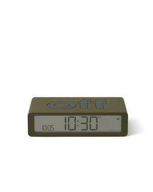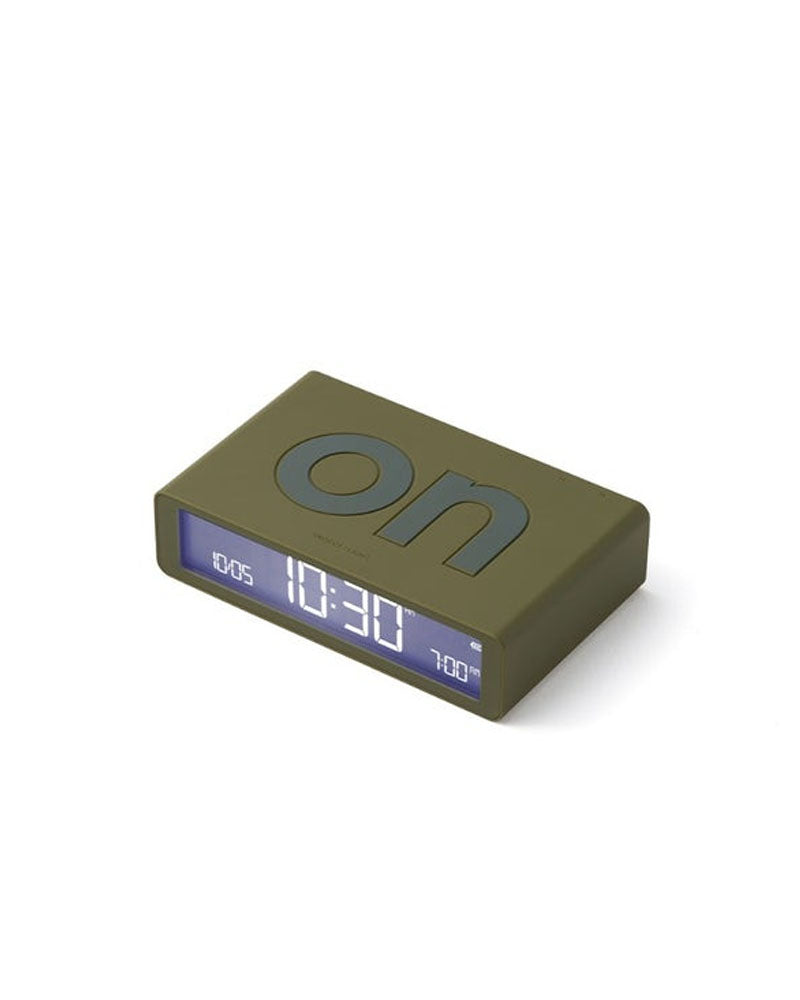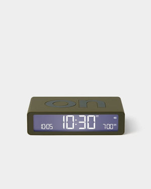 Réveil réversible LCD / coloris kaki / faces on & off / écran LCD avec 3 niveaux de luminosité / fonction snooze et rétroéclairage tactiles / rechargeable via usb-c avec câble inclus / autonomie jusqu’à 6 mois / temps de charge 4 h / alimentation via adaptateur secteur usb 5v (non inclus)