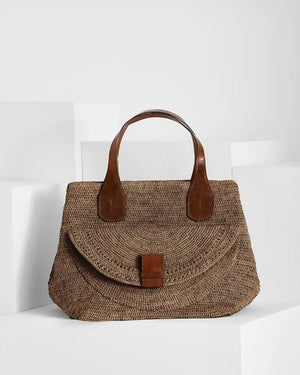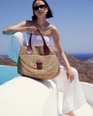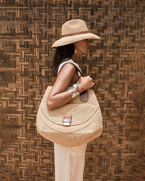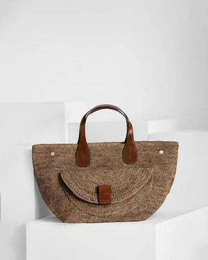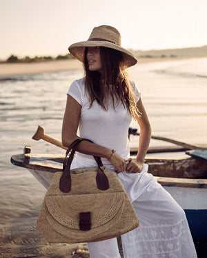 Composition : 100% raphia naturel (matière naturelle et durable). Les poignées sont en cuir de zébu tanné selon un procédé végétal.