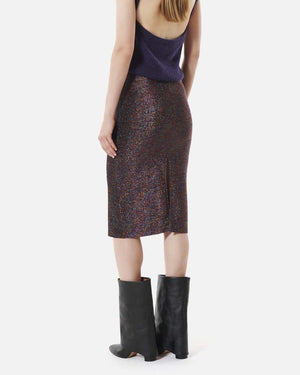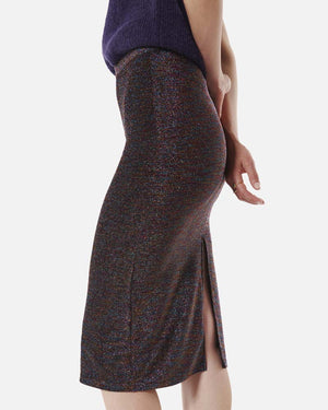 Une jupe pour femme scintillante de la marque Karma Koma. Cette jupe crayon moulante est parfaite pour une tenue de soirée scintillante ! On adore le confort de cette jupe mais aussi sa coupe crayon féminine et ses fines paillettes.