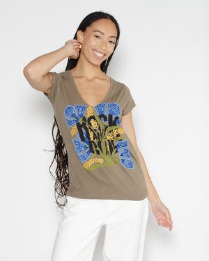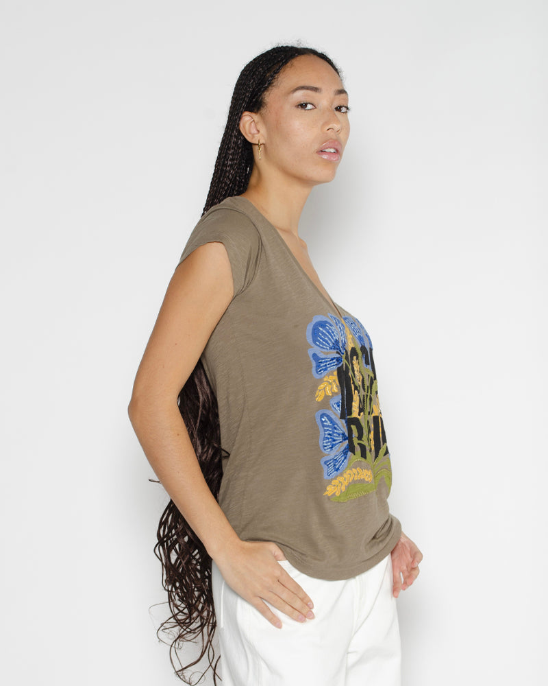 Tee-shirt Leon & Harper pour femme. Ce tee-shirt à col V structure le vêtement. Son motif fleuri et l'écriture sur le devant lui apporte une touche féminine et glamour. Facile à porter, on adore ce tee-shirt rock de Leon & Harper.