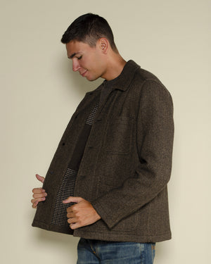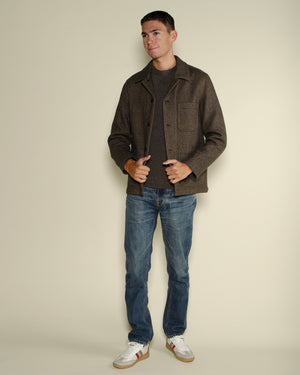 Matière chevron / Couleur marron / Trois poches / Col chemise / Style workwear chic / Idéale en veste de mi-saison / Touche vintage et structurée.