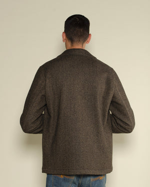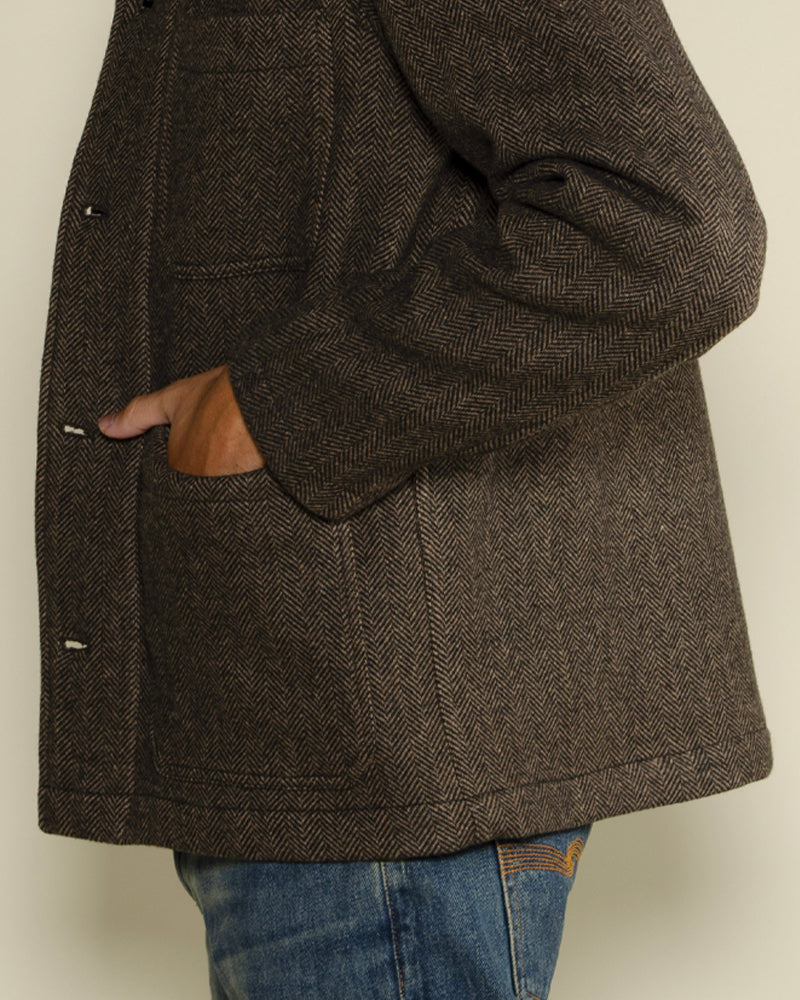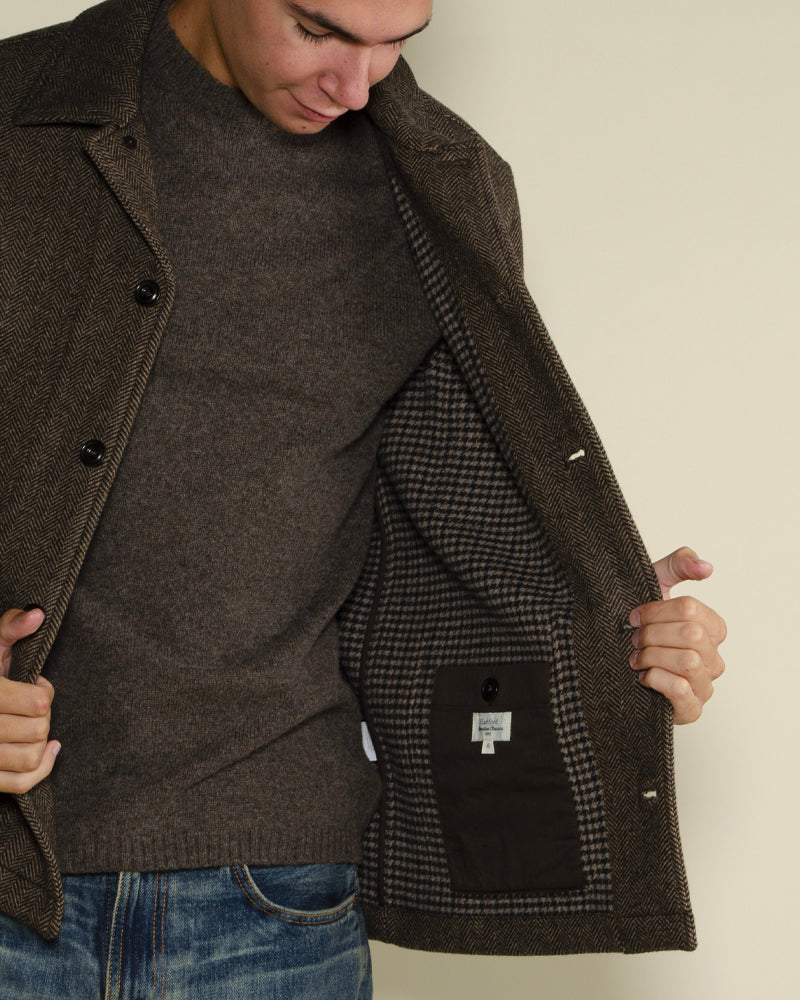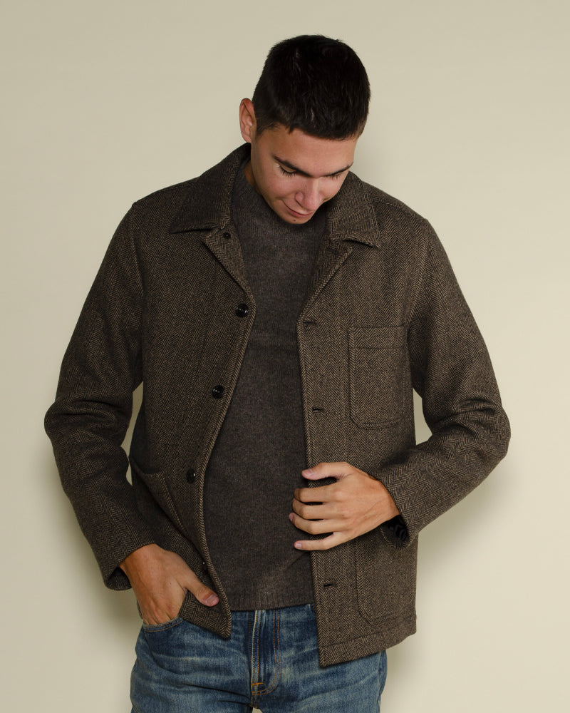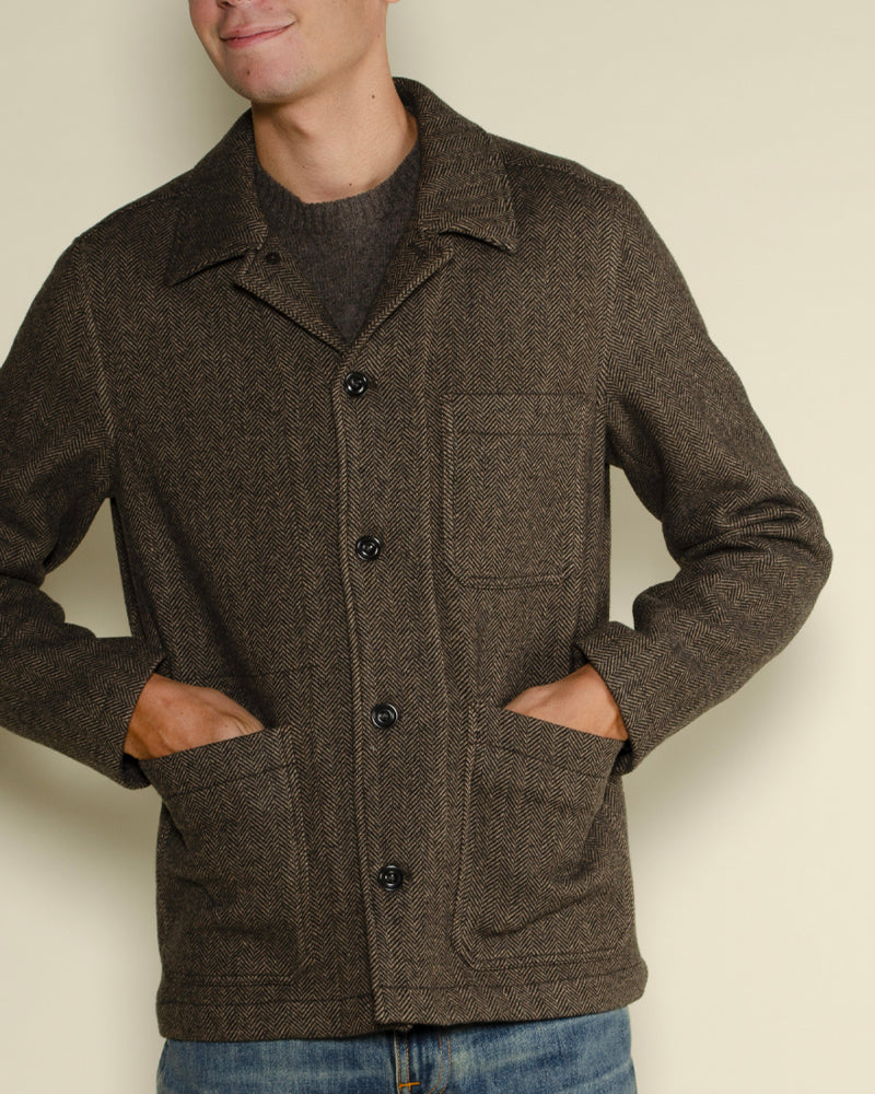 Matière chevron / Couleur marron / Trois poches / Col chemise / Style workwear chic / Idéale en veste de mi-saison / Touche vintage et structurée.