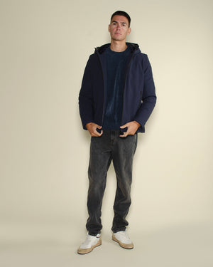 coupe droite / style classique / doublure matelassée / fermeture zip / détails orange fluo / capuche
