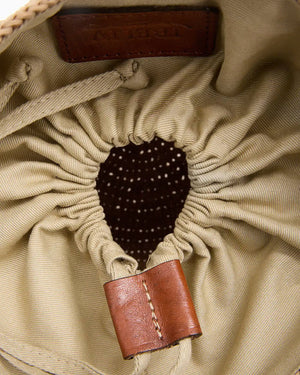 Le panier en raphia possède un rabat intérieur à coulisses en coton bio qui permet de cacher le contenu du sac et de le fermer avec un lien. La bandoulière en cuir est tressé cascade et les anses sont plates et amovibles.