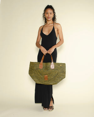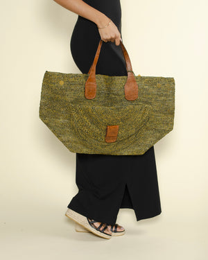 Composition : 100% raphia naturel (matière naturelle et durable). Les poignées sont en cuir de zébu tanné selon un procédé végétal.