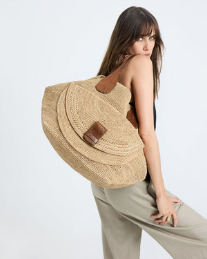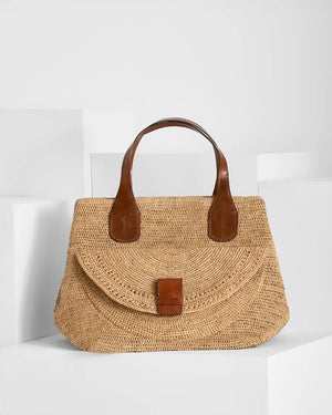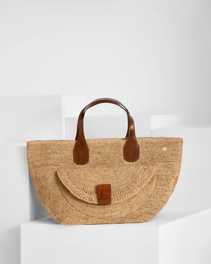 Composition : 100% raphia naturel (matière naturelle et durable). Les poignées sont en cuir de zébu tanné selon un procédé végétal.