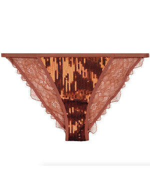 Culotte style tanga en sequins marrons, finition bordure festonnée, doublure en jersey de coton tout doux, fine dentelle florale semie-transparente à l'arrière.