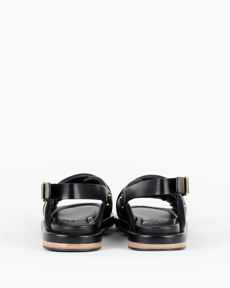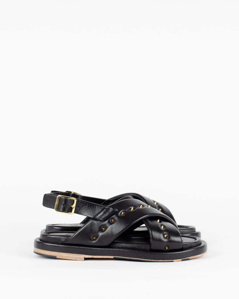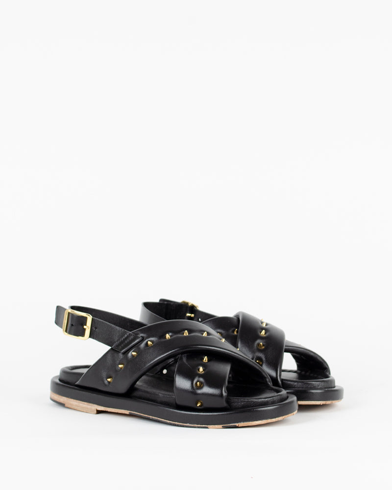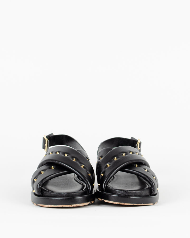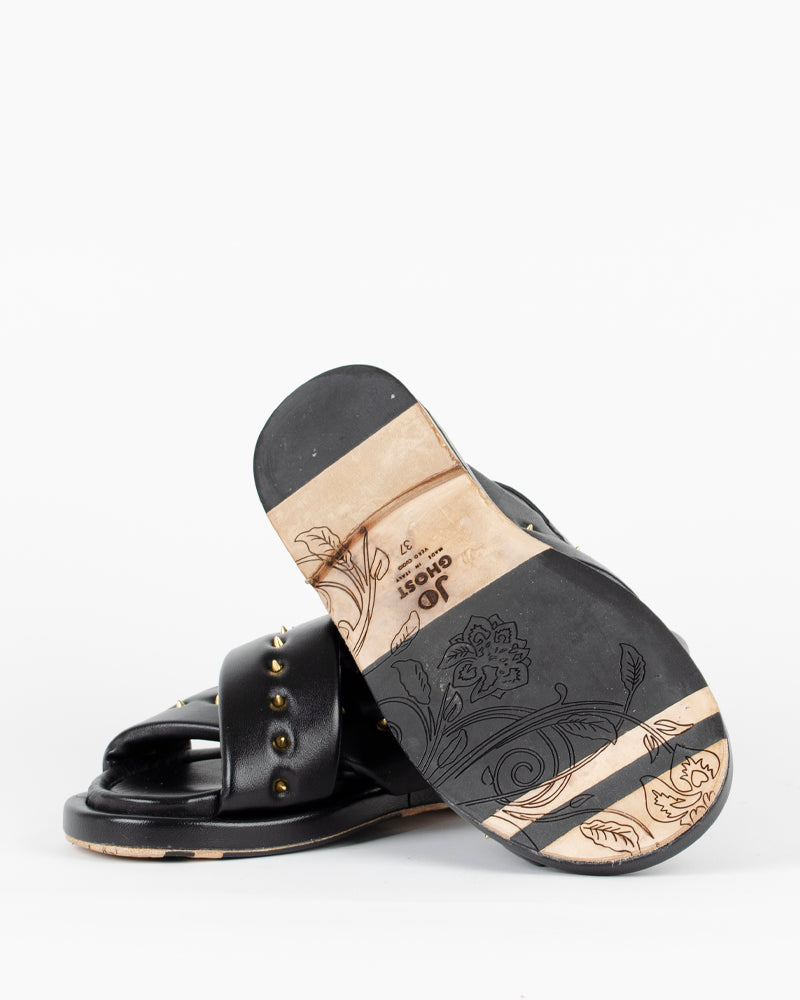 Must have ! Une Paire de sandales noire cloutée pour femme de la marque Jo Ghost, l'intemporelle à avoir dans son dressing !On adore les petits clous argentés qui donne une allure rock à cette paire et que vous pourrez associer très facilement à vos tenues d'été !