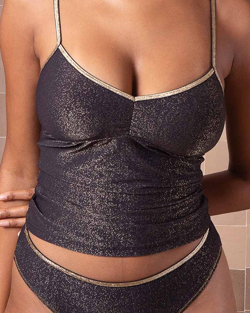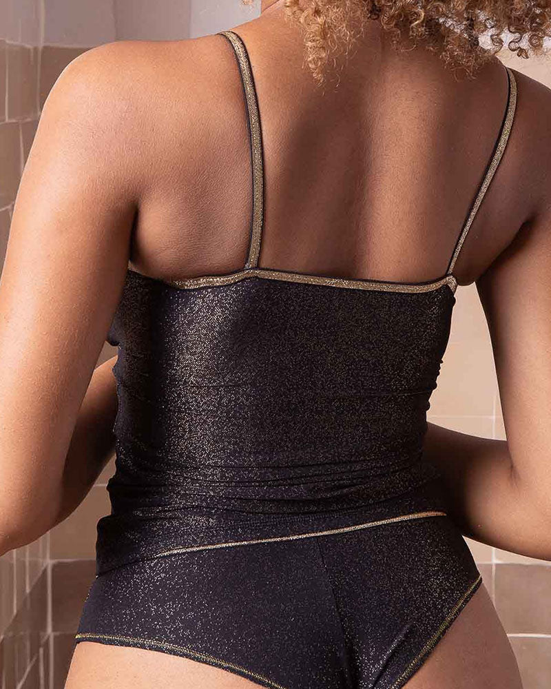 Un caraco noir / décolleté froncé au centre / très tendance / effet satin / près du corps