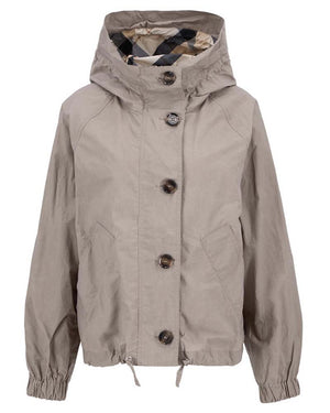 Une veste imperméable courte pour femme signée Barbour. Elle est dotée d'une grande capuche avec intérieur tartan et d'un cordon de serrage au niveau du col.