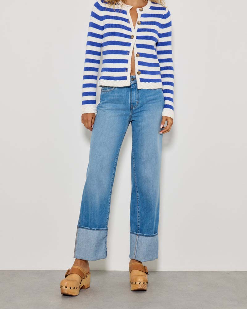 Jean à gros ourlets de la marque Five pour femme. Ce jean est au top des tendances pour la saison printemps-été 2025. On est fan des grands ourlets associés à une coupe droite, pour une silhouette mise en valeur et ultra-moderne.