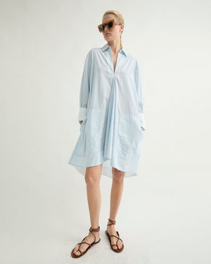 La robe tunique Vary bleue pour femme de chez Laurence Bras. On adore cette jolie robe à fines rayures, avec les poches visibles à l'avant. Une pièce tendance et chic pour cette saison.