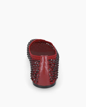 coloris bordeaux / tissu orné de cristaux / surface scintillante / bout arrondi / talon plat / style bijou / confort quotidien / allure élégante et lumineuse