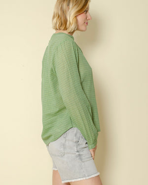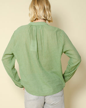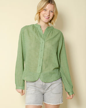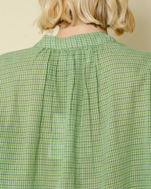 Tunique verte à petits carreaux / encolure légèrement froncée pour un esprit plus doux / patte de boutonnage fine et discrète / coupe fluide