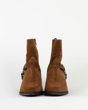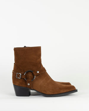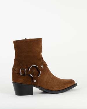 Des santiags en cuir suédé de couleur marron cognac et de la marque Les Venues. On est fan de ces santiags marron cognac pour femme en cuir suédé, confortables et ultra tendance !