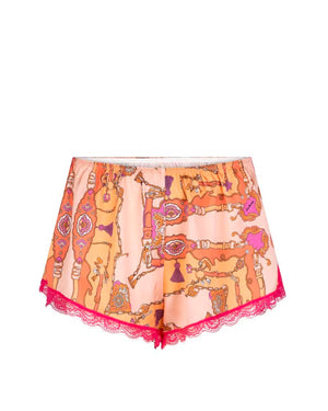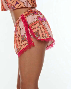 Un short de pyjama avec un imprimé graphique, on adore ! La bordure brodée en rose est top tendance et le toucher "satin" est très confortable. On adore !