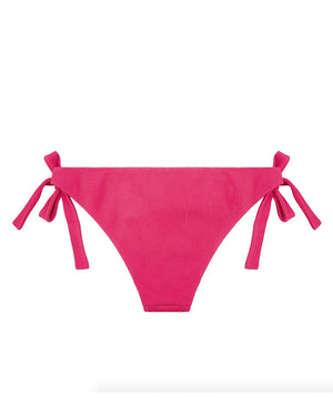 Bas de maillot de bain fuchsia, texture côtelée, liens ajustables sur les côtés, petite pièce dorée estampillées des initiales de la marque sur le devant.