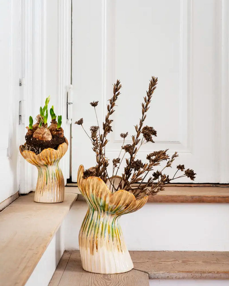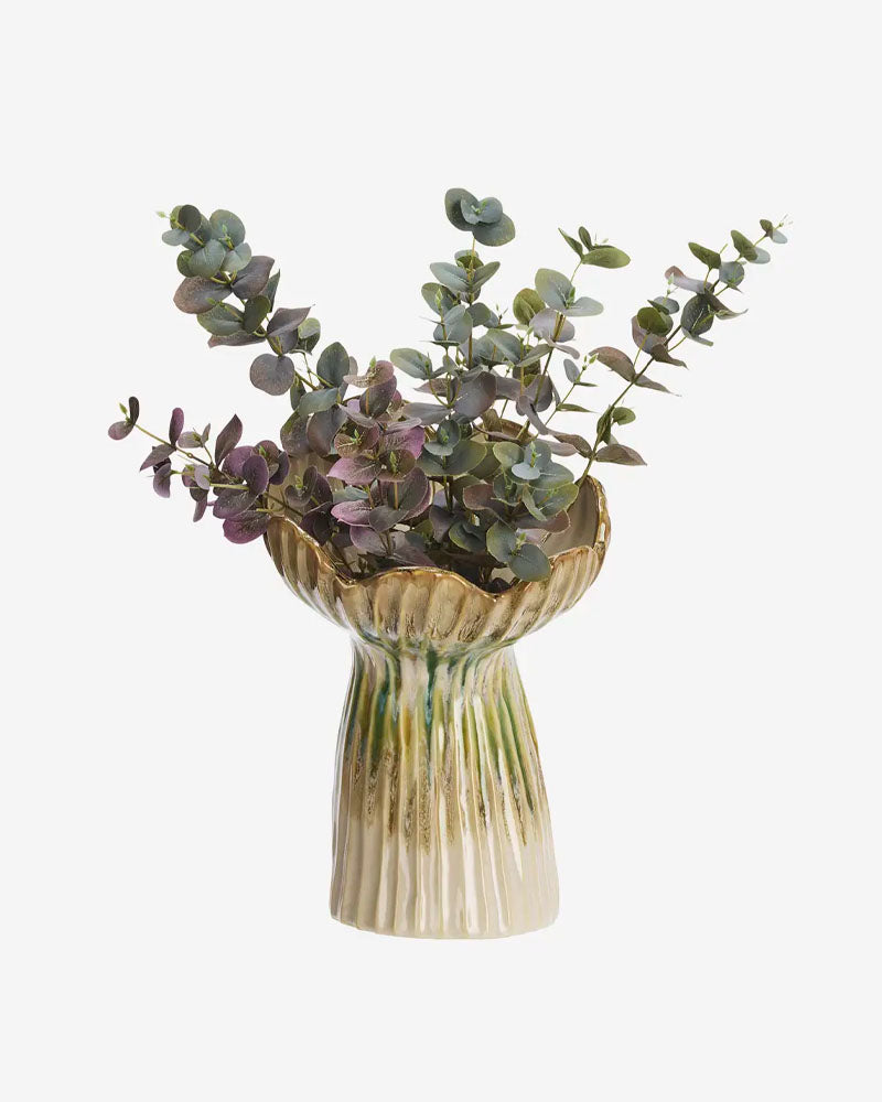 Grand modèle / Vase en grès / fabrication artisanale en chine / décoré à la main dans des tons beige, vert et moutarde / lignes inspirées de l’art déco pour une élégance sculpturale