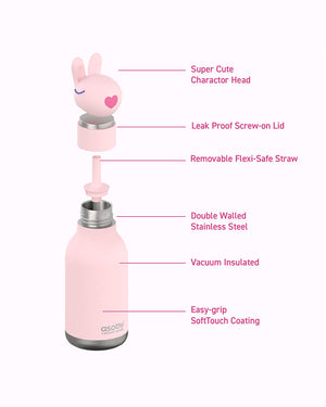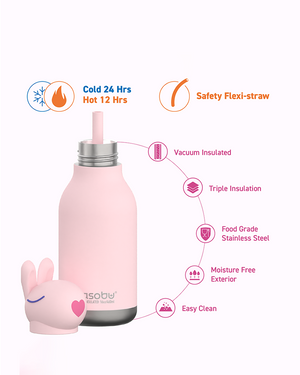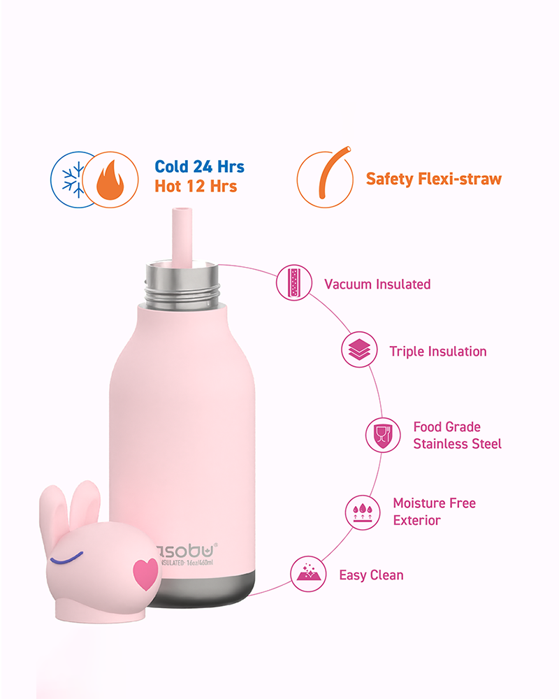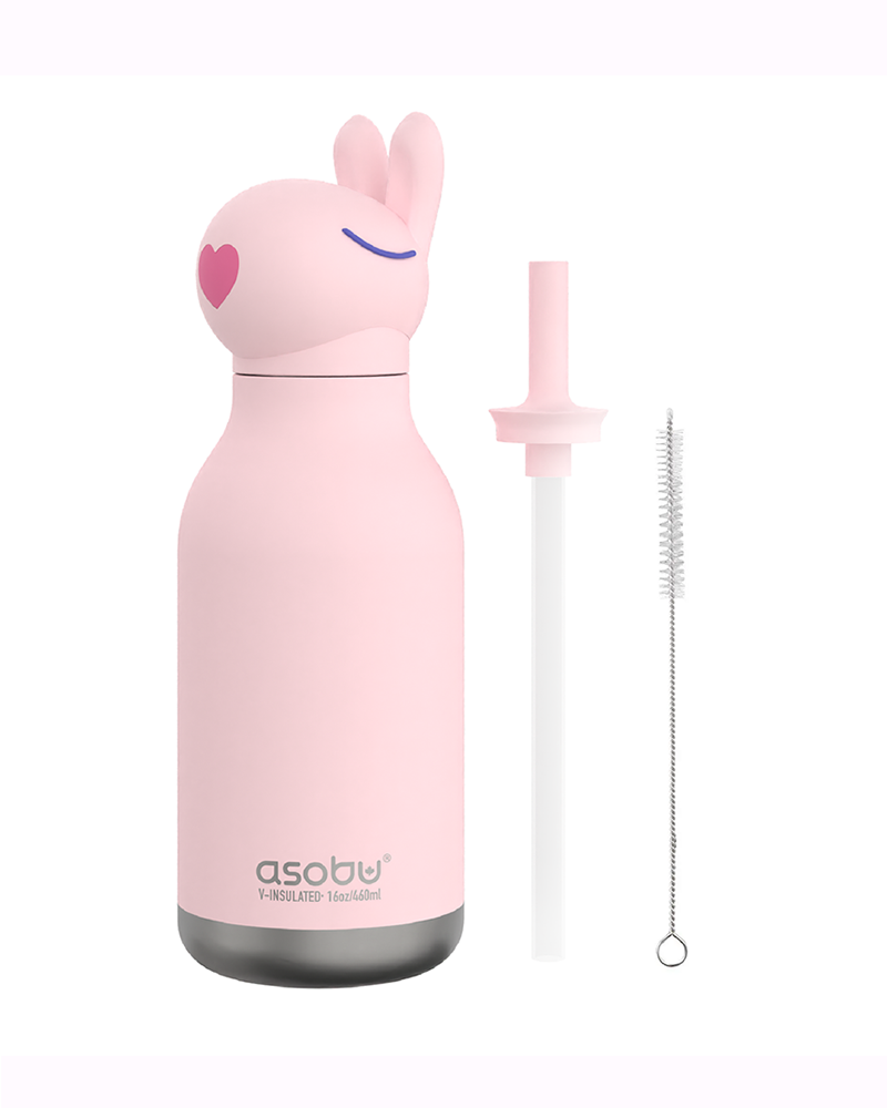 Garde votre boisson au chaud pendant 12 h et au froid pendant 24 h / tête de lapin rose en silicone amovible / paille / revêtement en silicone pour éviter de se brûler / petite brosse à bouteille fournie