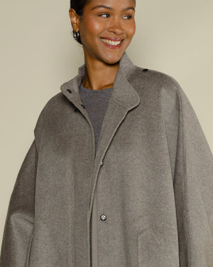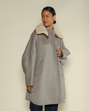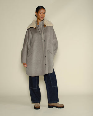 Manteau Blonde n°8 gris / Coupe oversize élégante / Large col en fausse fourrure contrastante / Fermeture zippée discrète / Grandes poches à rabat pratiques / Laine mélangée chaude et confortable