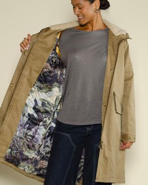 Parka Blonde n°8 beige / Coupe longue et droite / Capuche protectrice avec col montant / Fermeture zippée sous patte pression / Grandes poches à rabat pratiques / Doublure intérieure imprimée