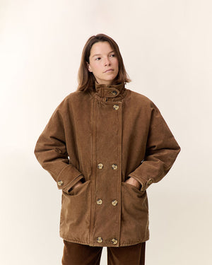 Le manteau Leon and Harper / coupe droite / structure la silhouette / grands boutons / double boutonnage / col montant modulable / poches plaquées