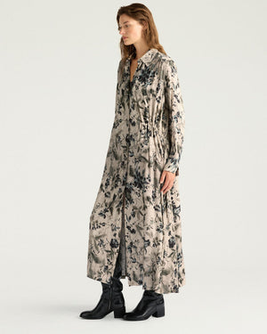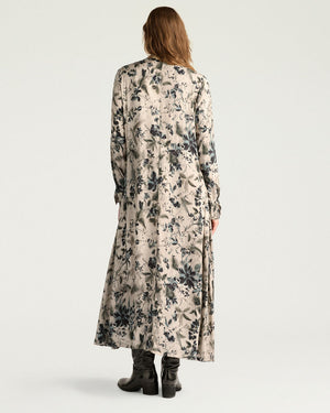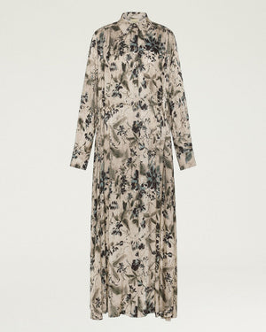 Tissu jacquard fluide en viscose / Imprimé raffiné / Coupe longue chemisier / Cordon de serrage intérieur ajustable / Fronces personnalisables / Boutons en nacre véritable