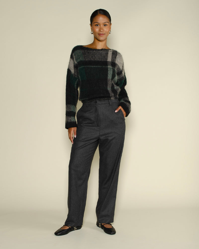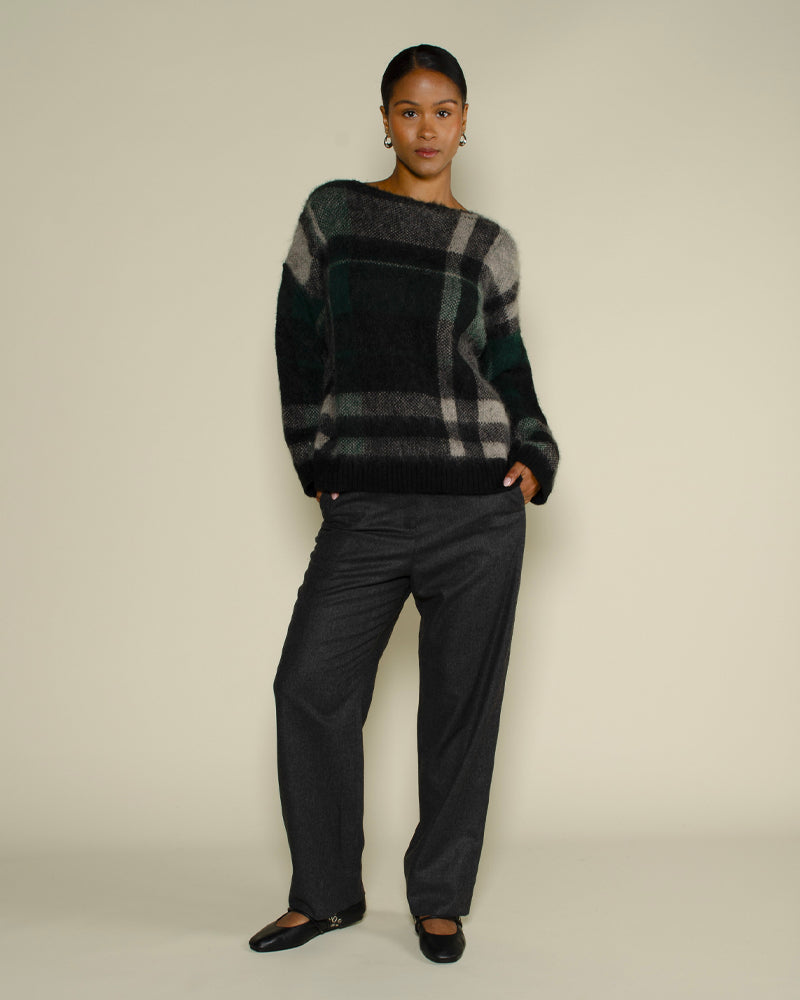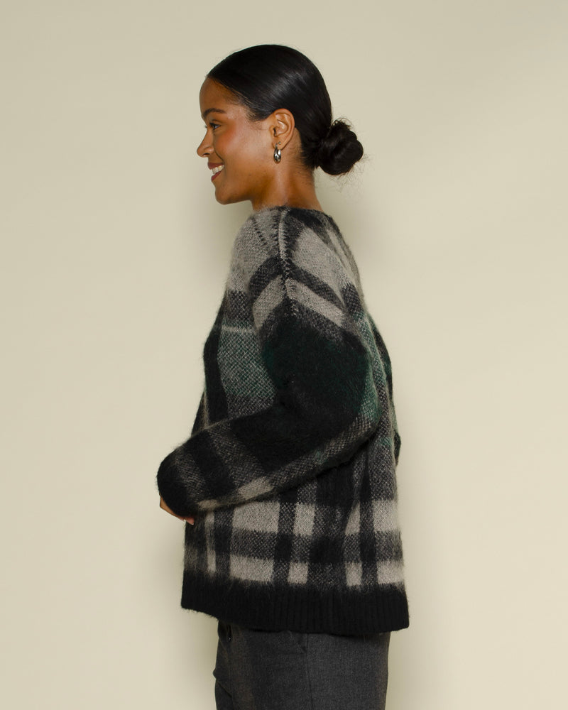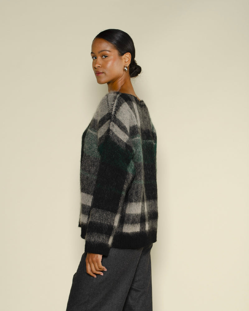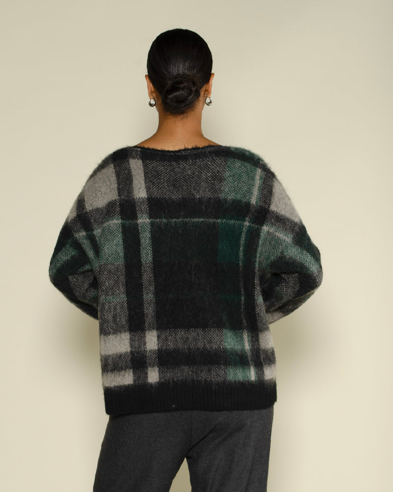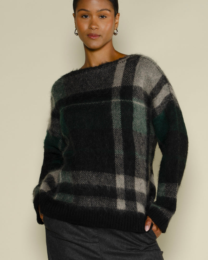 Tricot jacquard brossé / Motif maxi tartan / Coupe oversize / Manches fourreau / Encolure bateau / Finitions nettes / Bas de manches et ourlet en côtes unies
